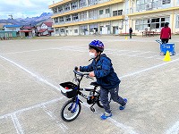 校庭に、直線やくねくね道・止まれの標識・踏切・横断歩道など、多くの場面を設定し、各場面での安全な自転車の乗り方について学習しました。
