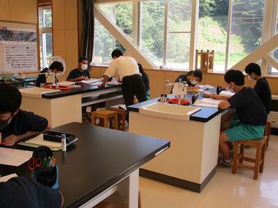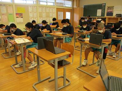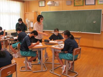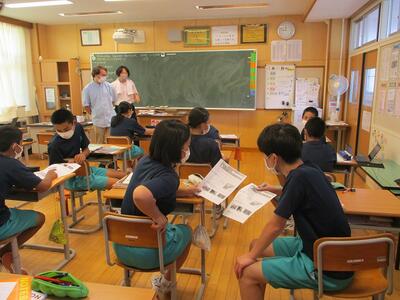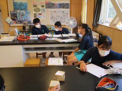 2022年9月14日 12時21分本日の4校時、1年生は総合学習。町探検学習のまとめを文化祭でどのように発表するか、班で話し合っていました。