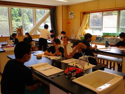 3年生は理科。速さについて実験を交えながら意見交換をしていました。