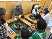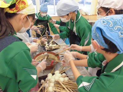 例年、講師としてお招きしている、中川さん、渡部(福)さん、遠藤さん、渡部(俊)さんのご指導を頂きながら、家庭科の時間に「しんごろう」と「くじら汁」を調理し会食しました。