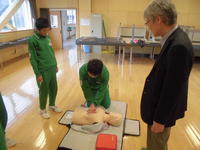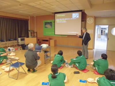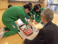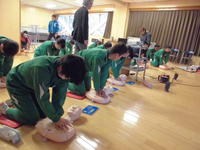 AED(自動体外式除細動器)の使用法を中心に、使用に際しての心構えについてもお話しいただきました。生徒たちは、講師先生の軽快な口調に思わず引き込まれ、真剣に取り組んでいました。
