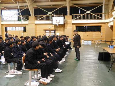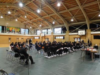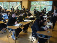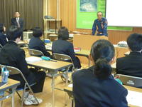 提案授業では、避難所での中学生の行動について考えた想定学習とゲストティーチャーとして地域で活躍する消防団長からのお話しを聞きました。