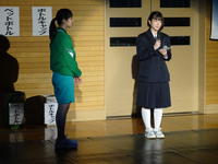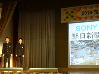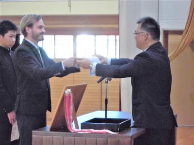 そこで今回は、漢字検定9級満点合格証を得たスコット先生と、びわのかげ陸上記録会1500m成年男子1部で優勝した馬場亮太先生にも、ステージに上がっていただきました。