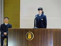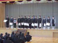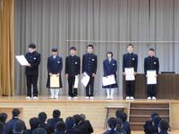 本校では、各種大会の賞状は、大会会場の表彰式で頂いてきた場合は「受賞報告」を行います。今回は、郡中体連総合大会、びわのかげ陸上記録大会、県陸上大会の受賞報告を行いました。