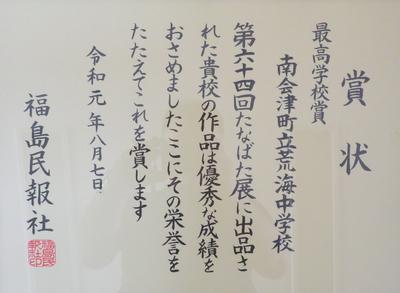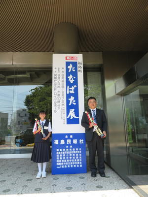 8月7日 福島市の福島民報ビルで、第64回福島県たなばた展の表彰式が開催され、過日皆さんにお知らせしました「最高学校賞」の賞状とトロフィーを頂いてきました。たなばた賞を受賞した1年の星綾乃さんも参加することが出来たので、一緒に写真を撮ってきました。