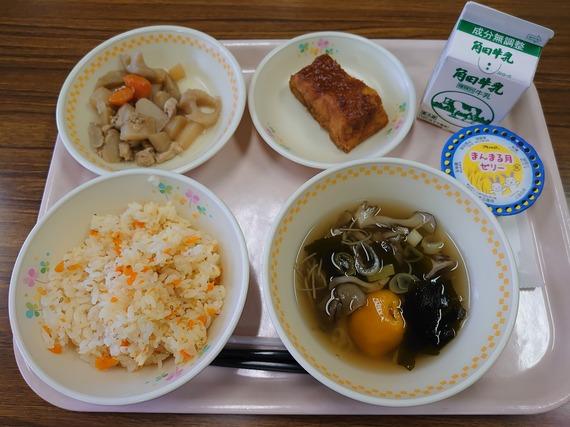 2020年10月1日 12時05分人参ご飯、乳、月見だんごのすまし汁、厚揚げの田楽、筑前煮、月見デザート