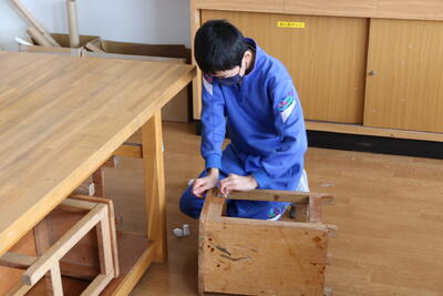 図工室の机をピカピカに磨く姿。