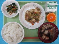 今日の献立は「麦ごはん、牛乳、中華スープ、兵助の肉豆腐、ナムル、みかん」でした。兵助の肉豆腐は、アニメ「忍たま乱太郎」の中で、久々知兵助が友達のために作る自慢の豆腐料理です。おいしくいただきました。ご家庭でもお子さんと作ってみてはどうでしょうか・・・