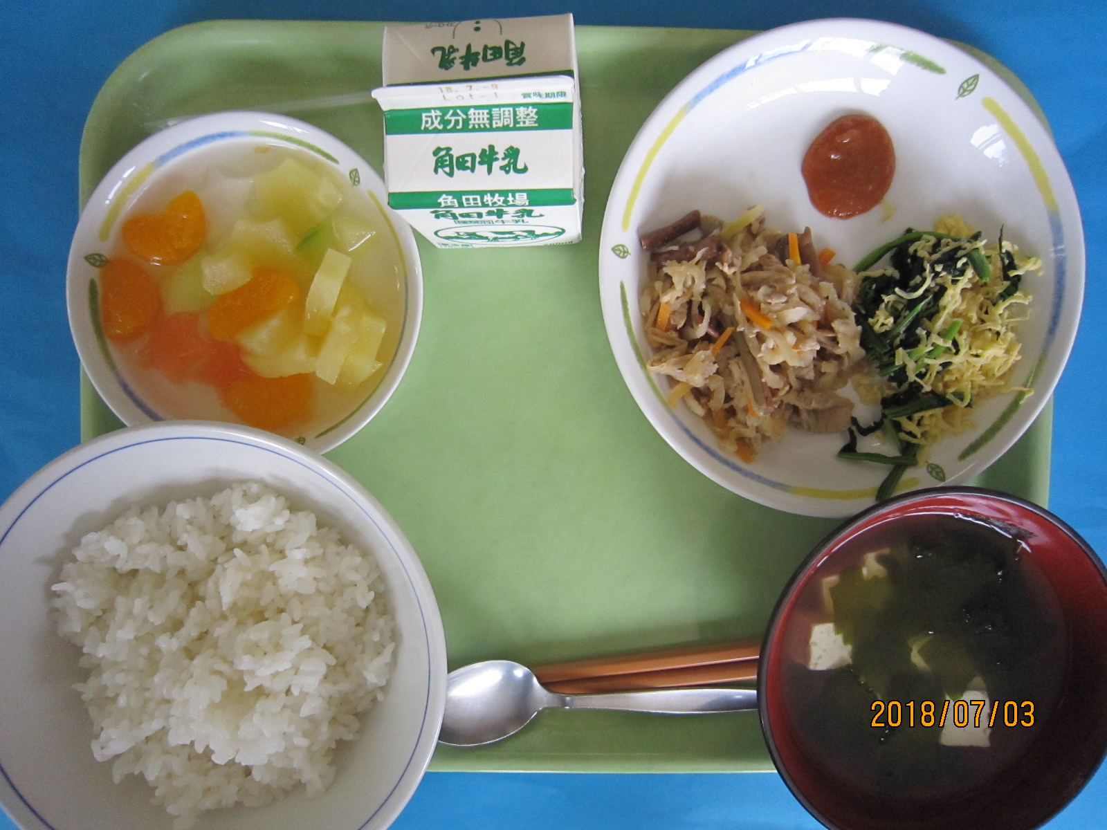 2018年7月3日 12時36分明日から宿泊学習があるため、今日が少し早いたなばた献立(牛乳、ビビンバ、わかめスープ、杏仁豆腐)でした。杏仁豆腐には、星形ゼリーが入ってかわいらしかったです。暑さが厳しいですが、ビビンバを食べて元気になったように思います。ごちそうさまでした。