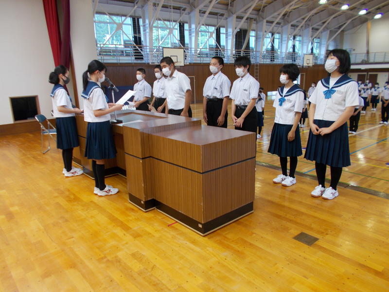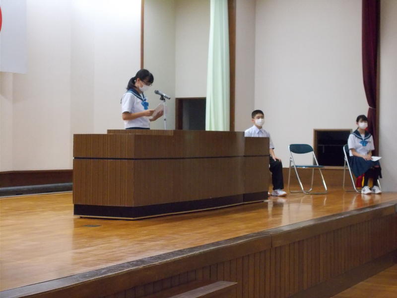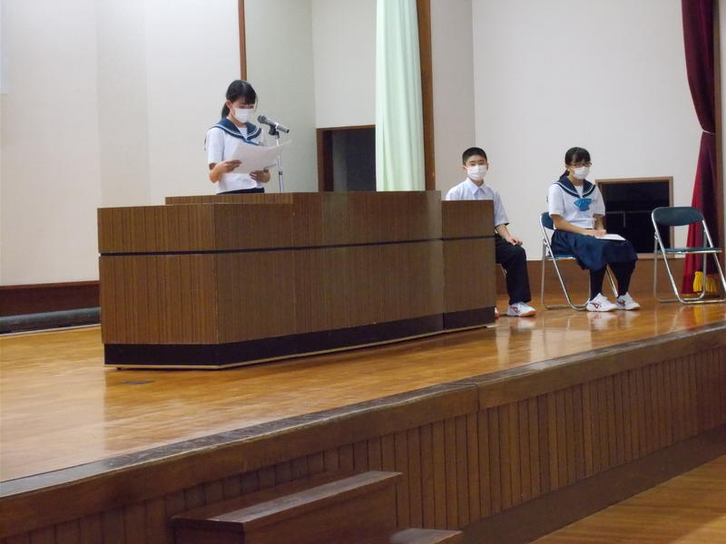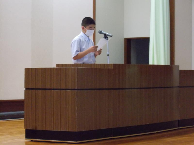 終業式の中で、1学期の反省と夏休みや2学期への抱負を学年代表の3名が発表してくれました。