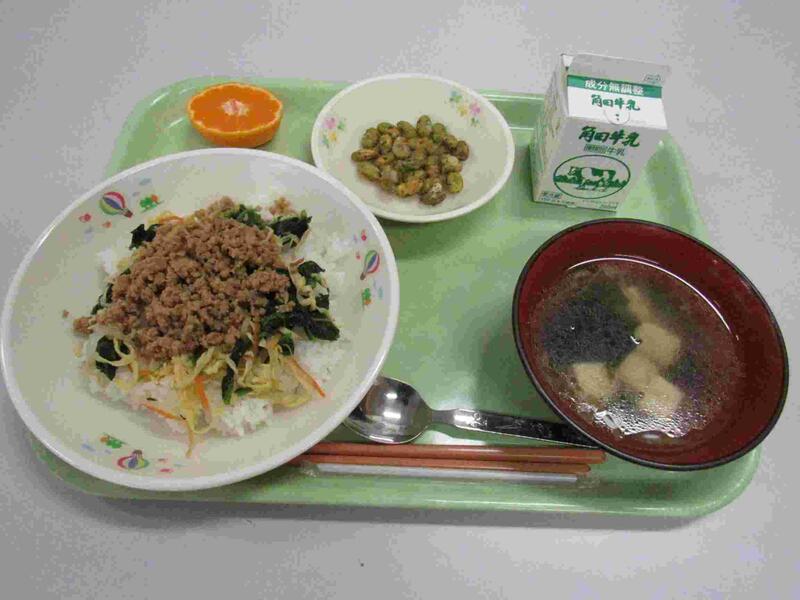 ・ビビンバ ・牛乳 ・わかめスープ ・フライビーンズ ・みかん