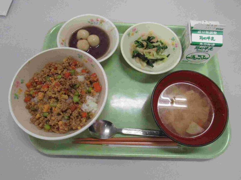 ・三色そぼろ丼 ・牛乳 ・大根のみそ汁 ・ツナとほうれん草の和え物 ・おしるこ