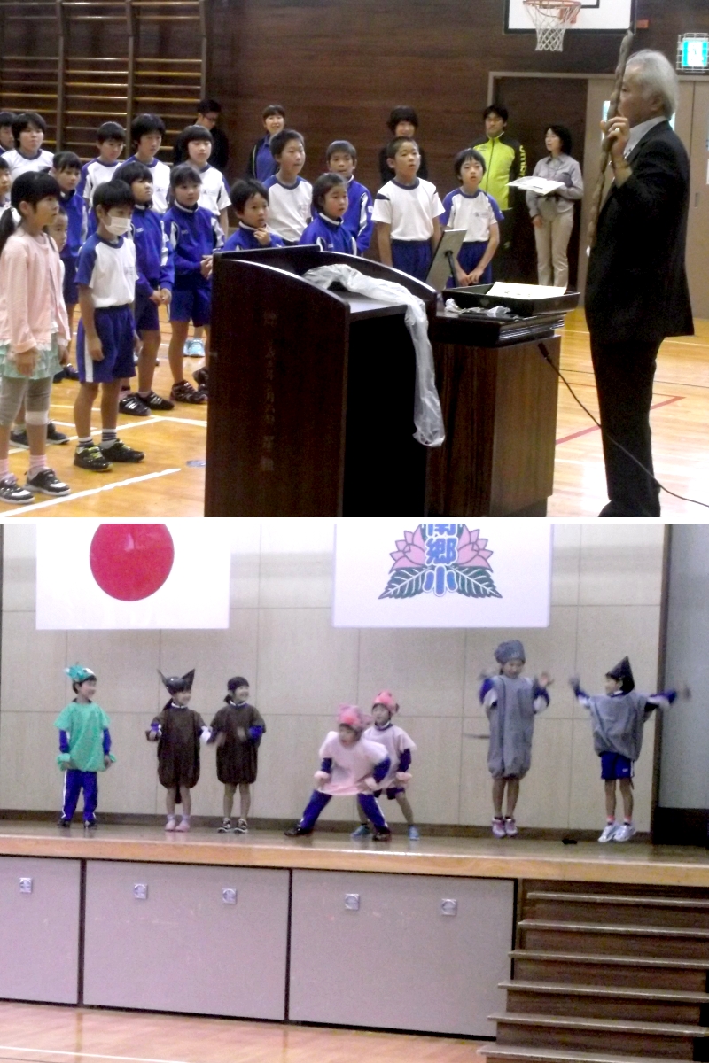 また、2年生の音楽発表がありました。学習している「ぴょんぴょんロックンロール」にちょっと衣装を着けての演技です。「可愛いい」と職員からも上級生からも声の上がる楽しい発表でした。