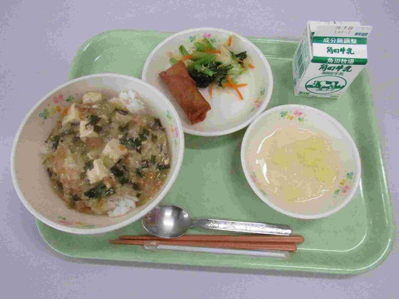 ・麻婆どんぶり ・牛乳 ・パリパリ春巻き ・小松菜ナムル ・りんごの寒天ジュレ