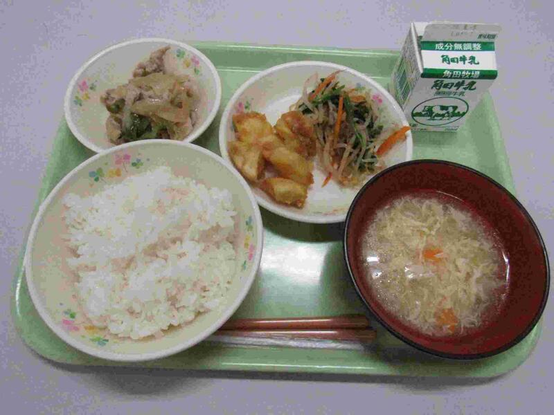 ・ご飯 ・牛乳 ・かきたま汁 ・豚肉のしょうが焼き ・おひたし ・じゃがくん