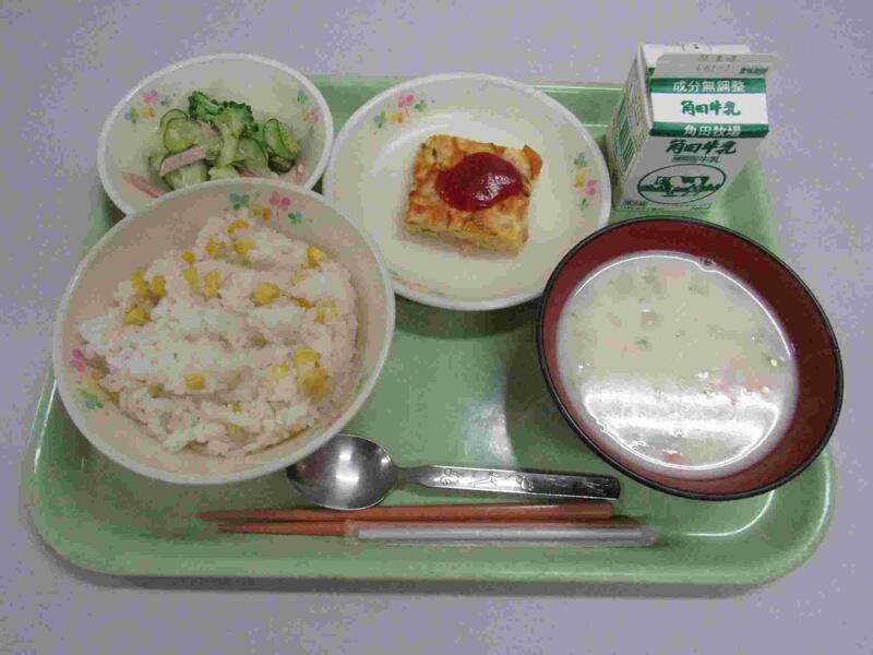 ・コーンご飯 ・牛乳 ・クラムチャウダー ・エビオムレツ ・グリーンサラダ