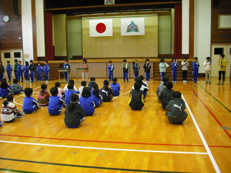 今日は、全校朝会で1年生の発表がありました。音楽で学習した「きらきら星」の合奏です。この8ヶ月でおぼえた鍵盤ハーモニカ、カスタネット、トライアングル、グロッケン、そしてウィンドチャイムの音が響きます。なにしろ、南郷小で最多の20人の学年です。横に並ぶと「長~い!」と感じてしまいます。