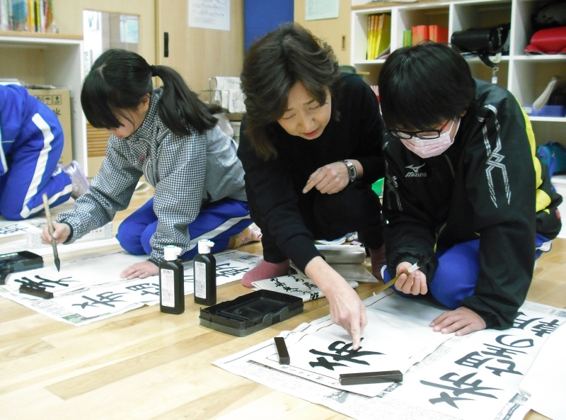 円を描いて穂先の向きを練習したり、手を取って筆運びの感覚を伝えていただいたり、丁寧に指導していただきました。ありがとうございました。明日の5年生、3年生もよろしくお願いいたします。