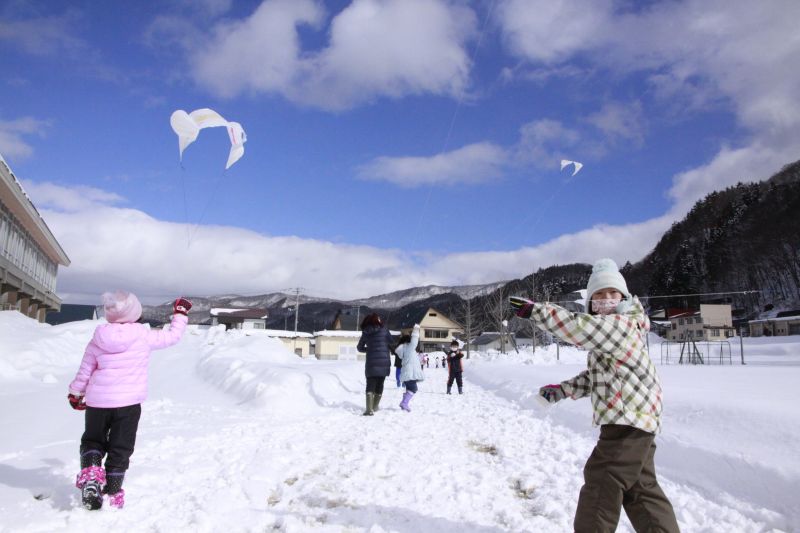 今日は、1年生が、生活科で作った凧を上げました。ちょうど雪が止み、ほどよい風が吹く中、青空に向かって、ぐんぐん上がっていきます。