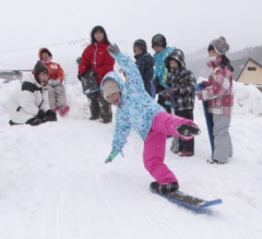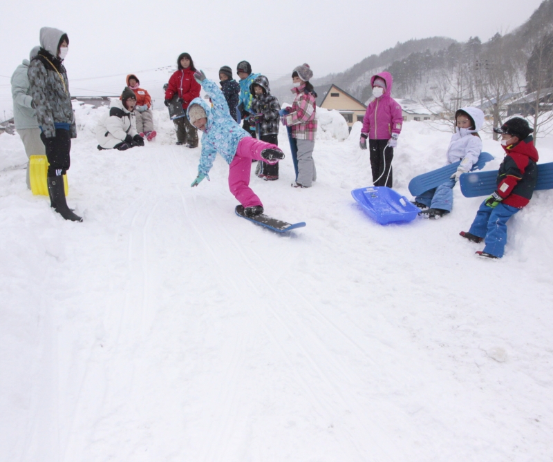雪の降った朝は、ブルドーザーが通学路を除雪して、寄せた雪で校庭に小山ができます。このちょっとした斜面が恰好の冬の遊び場です。大人になったとき、この風景をどんな気分で思い起こすのかなぁ、笑顔にカメラを向けながらそんなことを思いました。