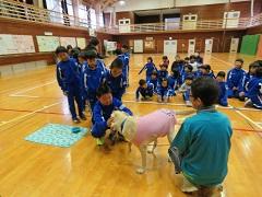2018年11月21日 11時31分19日(月)に、会津若松市から木村千栄美様、遠藤京子様ご夫妻の3名を講師に迎え、盲導犬の学習を行いました。盲導犬のプラス君が仕事をする様子を実際に見せていただきながら、盲導犬の仕事や、接するときの約束について学びました。学校では3年生の国語で「盲導犬の訓練」という学習をします。実際に盲導犬とのふれあいを通して、学習内容の理解を深めることができたのではないかと思います。