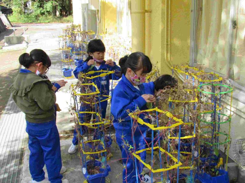 2020年10月27日 12時58分1年生が朝顔の種の収穫をしていました。
