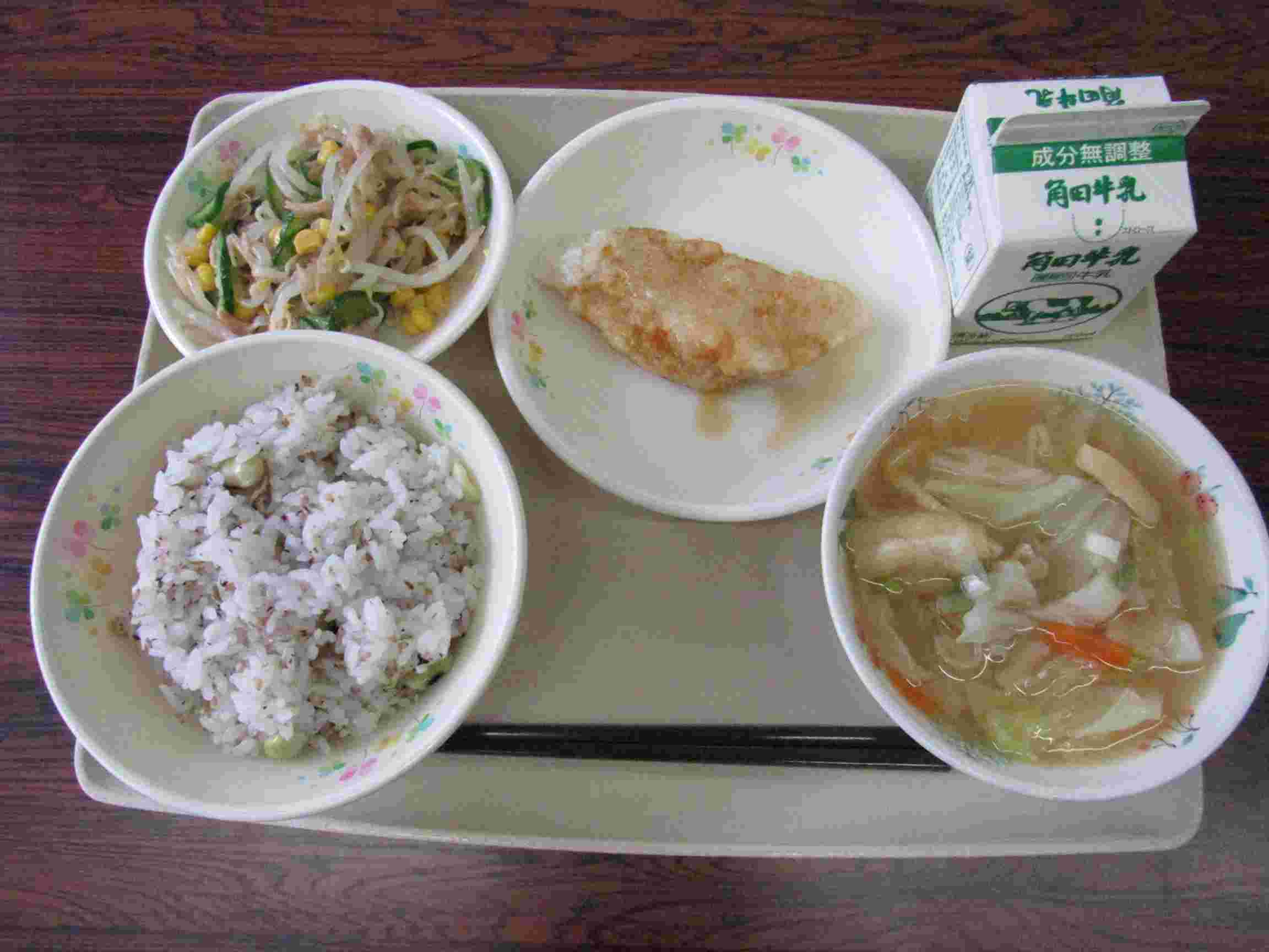 ・枝豆ごはん ・牛乳 ・キャベツの味噌汁 ・白身魚のレモン風味 ・和風サラダ