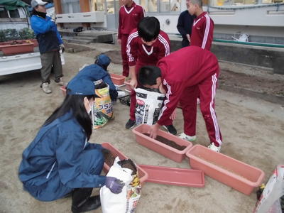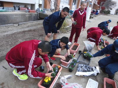2018年11月14日 10時37分11月13日(火)放課後に田島高校の生徒と先生方が草花を持って来校し、本校の環境奉仕員会の生徒と一緒に植栽を行いました。いただいた植物は「ビオラ」と「葉ボタン」です。ビオラは職員玄関わきに飾りました。彩り豊かな小さな花たちが来校者の心を和ませてくれます。手入れの仕方ひとつで花がたくさん咲きます。植物にも(子どもにも)愛情をたっぷり注いで、大切に育てていきたいと思います。