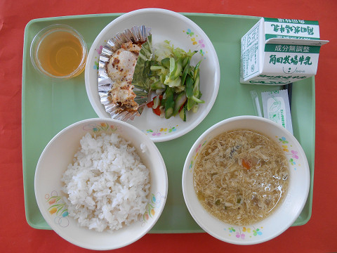 2016年5月24日 18時29分地元産のアスパラ、キュウリ、パプリカのサラダは見た目にも涼しげで夏の訪れを感じさせてくれました。鶏肉のマスタード焼きのピリ辛も食欲をそそる味で、休み明けのやや疲れた体に元気を与えてくれました。「ふわふわ卵がとってもおいしい!」かき玉汁も優しい味で、どれをとってもおいしい給食でした。感謝の気持ちで残さず食べました。