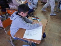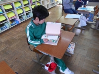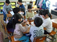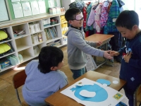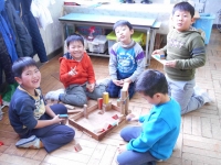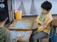「室内での遊び方を工夫しよう」のめあてを守り、仲良く楽しそうに遊んでいる子どもたちです。トランプや福笑い、積み木など、限られた遊び道具ですが、友だち一緒だと何をやっても楽しく感じるようです。お絵かきや読書など、一人遊びでも上手に過ごせる1年生です。