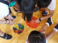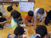 「パラシュート」づくりでは、ナイロンを八角形に切って、そこに糸を結びつける8本の糸を一つにまとめるところが、糸がこんがらがって難しかったようです。パラシュートのナイロンには絵を描いて素敵なパラシュートができあがりました。