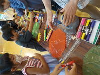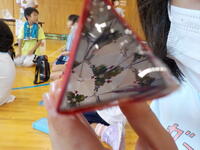 「万華鏡」づくりでは、核となる三枚の反射板をすき間なくきれいに三角柱になるように貼り合わせるところが、難しかったようでした。思い思いのビーズやひもなどを選んで筒の中に入れました。完成した万華鏡を覗いたとき、想像以上の見え方に驚いていました。