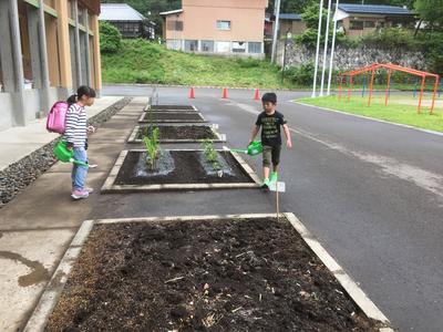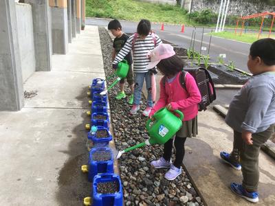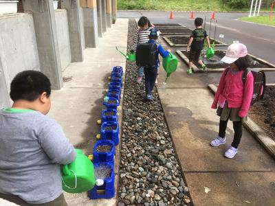 登校した子どもたちが、自分たちが植えた植物に水をあげています。