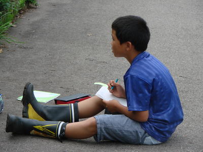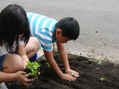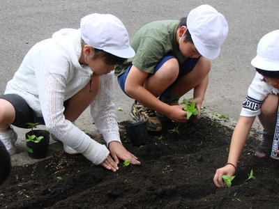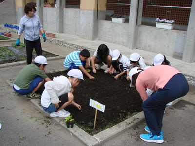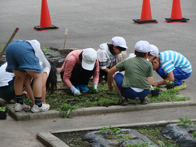 2019年6月27日 17時40分校舎前の畑に、3年生が花を植える準備をしています。