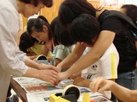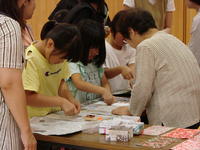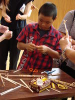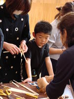 こどもたちは、割りばしでっぽう、万華鏡、切り絵、パラシュートの4コーナーにわかれ、