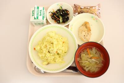 2021年12月17日 12時38分本日は、カレーピラフ、牛乳、コンソメスープ、鶏肉のマスタード焼き、ひじきのマリネ、クレープ、の一足早いクリスマスメニューの給食でした。クレープは、チョコかイチゴかを事前に選ぶことができましたが、チョコを選んだ生徒が圧倒的に多かったようです。下の写真もチョコのクレープです。