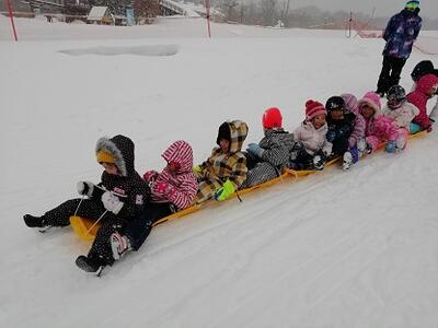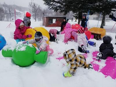 今日は雪が降り、時折吹雪くこともありましたが、子ども達は元気いっぱいでソリ遊びを楽しんでいました。前回なかったトランポリンの遊具には大喜びで、滑ってひっくり返っても、笑って起き上がり楽しんでいました。