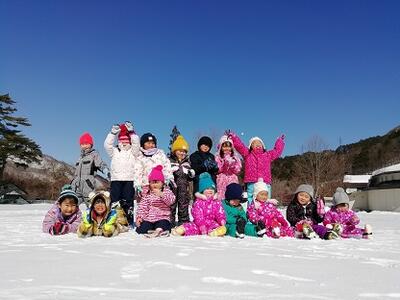 かた雪となった広いグランドで、走ったり転がったり、高い雪山から滑り降りたりしました。