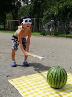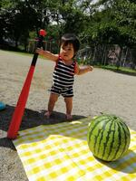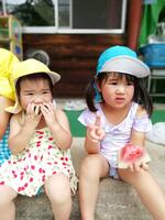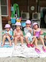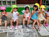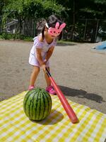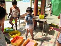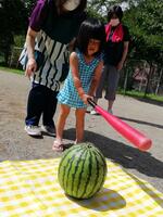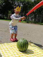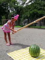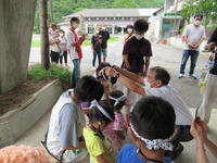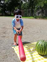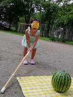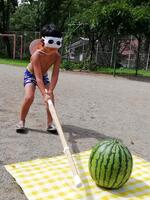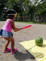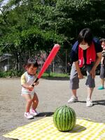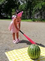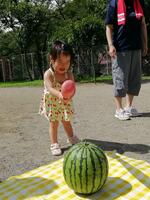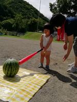 1・2歳児と年少組は、プラスチックバットを持ち、年中・年長組は竹刀を持ち、スイカに向かいました。年長組の数人がうまいことスイカをたたくことができましたが、残念ながら割れず・・・