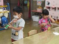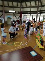 これまで、年長児が協力して祭りの準備をし、今日も「たこやきゲーム」やお化け屋敷のお店屋さんを担当して、みんなを楽しませてくれました。