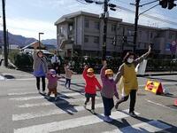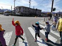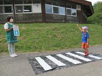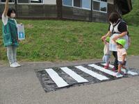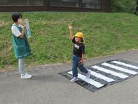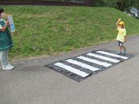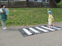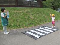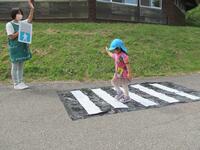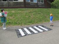模擬信号機と横断歩道を使い、信号機の見方や横断の仕方、車からの死角について学びました。