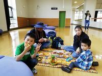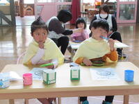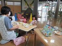 3歳~5歳児は、お弁当とおやつを、園外保育気分を味わいながらホールで食べました。