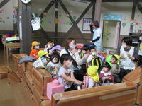 運転手は年長児が担当。「安全運転でしらかば公園までお願いしまーす!」