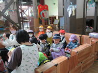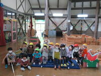 大型積み木でバスを作り、1・2歳児も参加して遠足ごっこを開始!