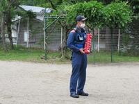火災発生の指示で、テラスより避難を開始。1・2歳児は泣き叫ぶことなく、3~5歳児はしっかりと話を聞いて、避難することができました。消防署の方からも所長さんからも100点満点でしたと褒めていただきました。