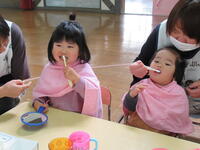 パネルシアターを使って、虫歯予防についての話をわかりやすくしていただいたり、染め出し液を歯にぬって、汚れをチェックし、ブラッシング指導をしていただいたりしました。