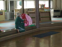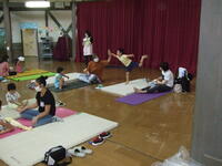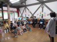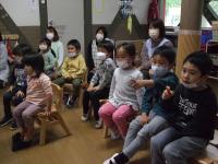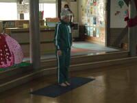 準備体操は「タコのポーズ」、そして「蟻地獄のポーズ」「ティーカップとポットのポーズ」「飛行機のポーズ」と楽しみ、整理体操「ゴリラのドラミング」で終えました。