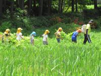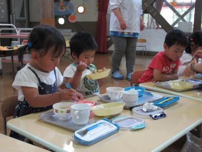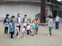 園児が給食に慣れ親しむとともに小学生との交流を通して、正しい食事の仕方を身に付けることなどを目的とし、うさぎ・パンダ組が年4回実施します。今日は1回目でした。最初に「苦手な物を頑張って食べる」などの目標を立て、給食の配膳を行いました。野菜が苦手な子も頑張って食べていました。