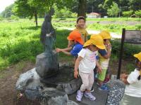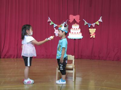 テラスに準備したプールの周りで、水の神様と安全祈願をしてからクラスごとにプール遊びを楽しみました。