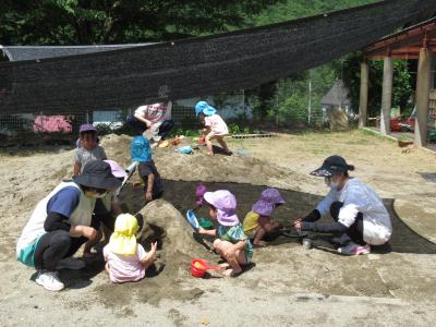 毎日暑い日が続きますが、子ども達は砂場で水遊びを楽しんでいます。